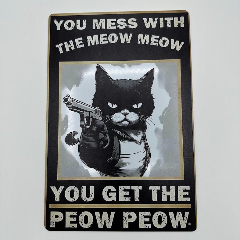 「MEOW MEOW(ニャーニャー)にちょっかい出すと、PEOW PEOW(バンバン)だぞ!」という、猫好きにはたまらないユニークでインパクト抜群のブリキ看板です。