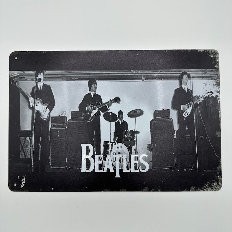 20世紀を代表する伝説のバンド「THE BEATLES(ビートルズ)」のステージシーンをモノクロで表現したブリキ看板です。