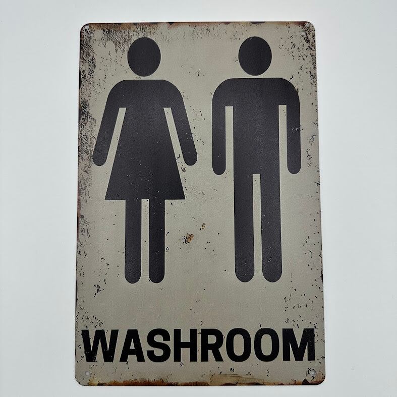 クラシックで視認性の高い男女共用トイレサイン「WASHROOM」をブリキ素材で再現したインダストリアル風看板です。