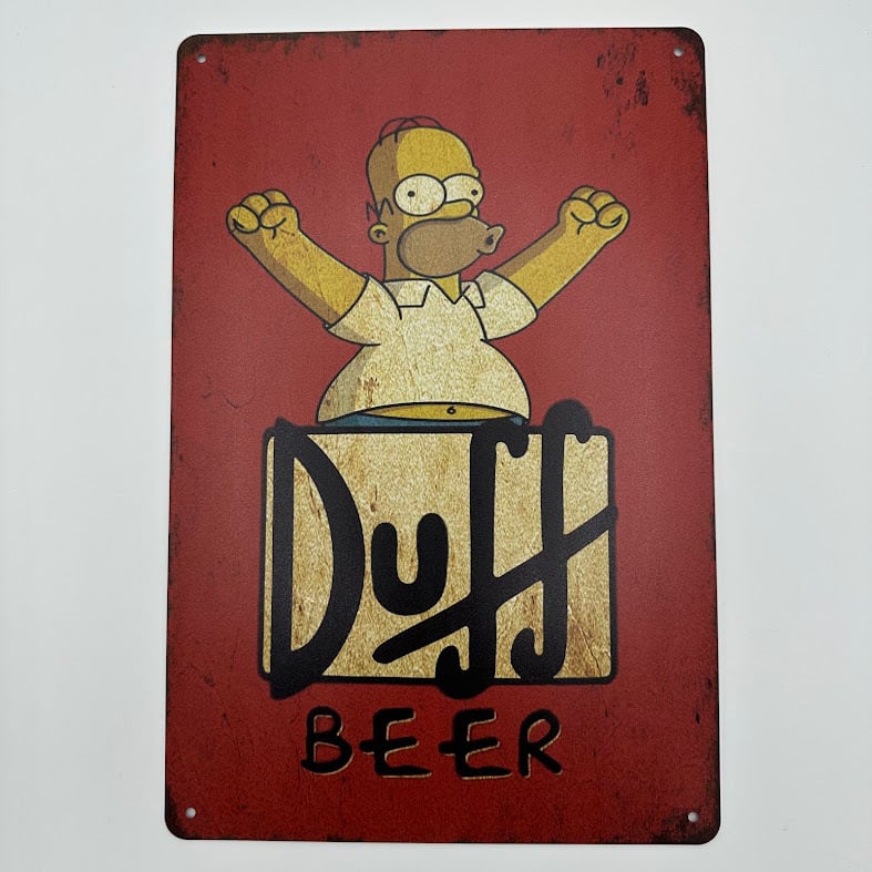 アニメ『ザ・シンプソンズ』の人気キャラクター「ホーマー・シンプソン」が描かれたユーモラスなブリキ看板です。