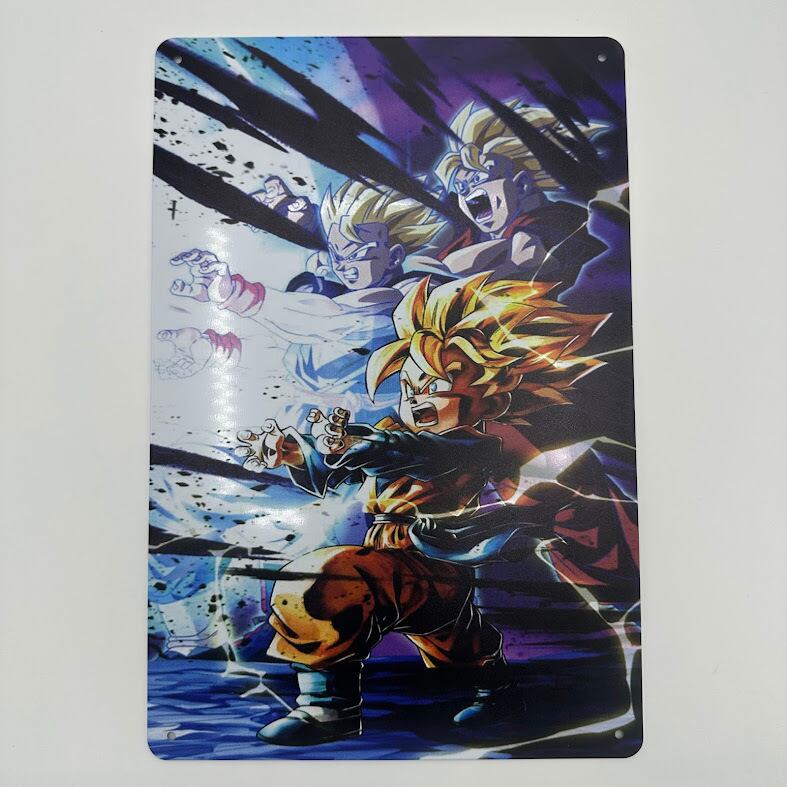 大人気アニメ『ドラゴンボールZ』のキャラクター、トランクス、孫悟空、孫悟飯が描かれた、エネルギー溢れる縦型ブリキ看板です。