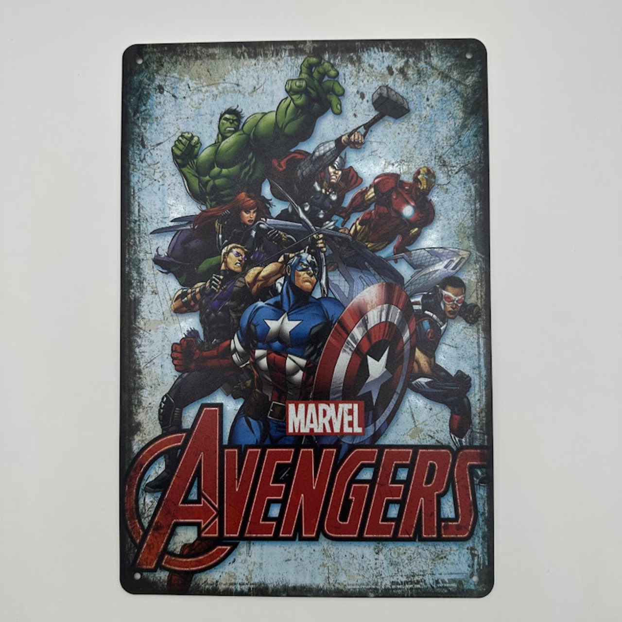 マーベルの人気ヒーローたちが勢ぞろいした、迫力満点のアベンジャーズ・ブリキ看板です。