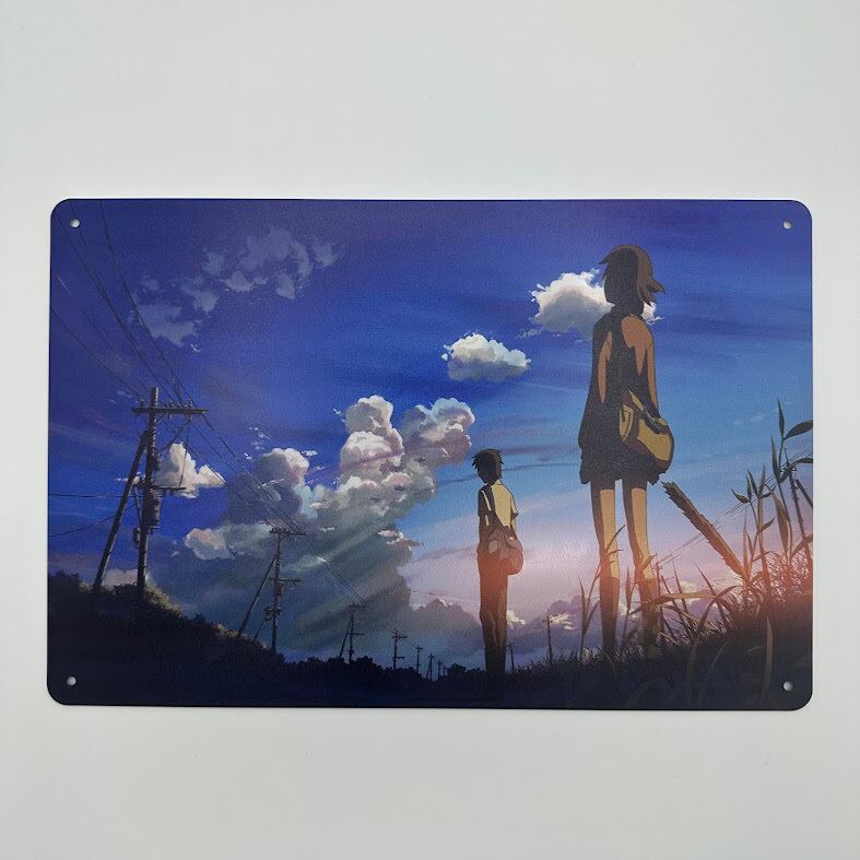 静かな夏の空と遠く離れる二人のシルエットが印象的な、映画「秒速5センチメートル」を思わせるブリキ看板です。