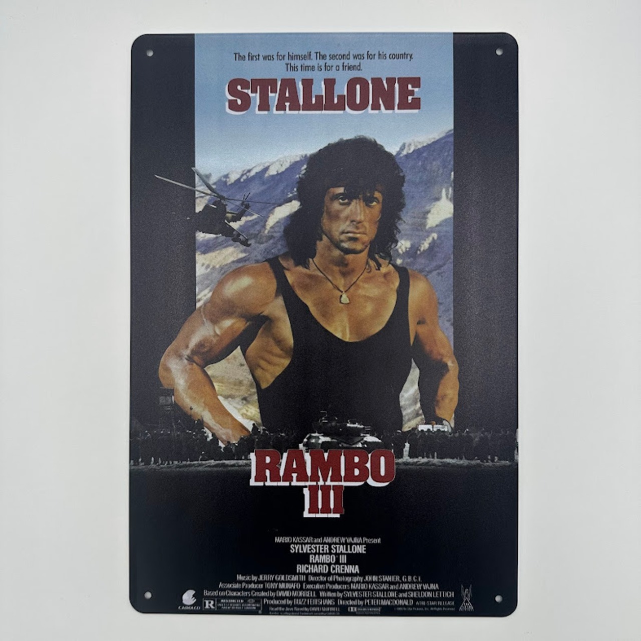 1988年公開のアクション映画『RAMBO III(ランボー3)』のポスターデザインをそのまま再現した、存在感抜群のブリキ看板です。
