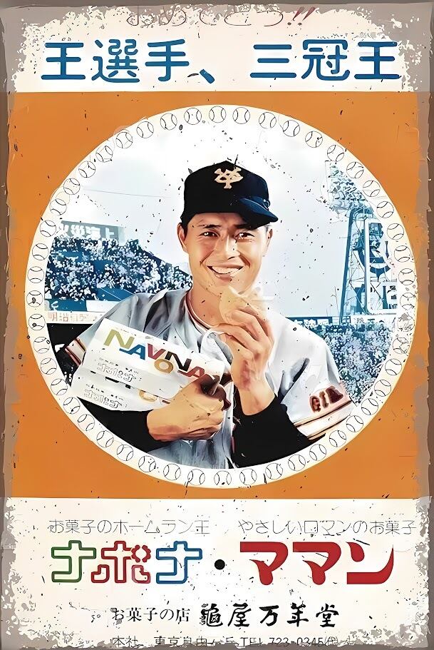 「王選手、三冠王」のキャッチコピーとともに、昭和の野球ブームと甘いお菓子の思い出が蘇ります。
