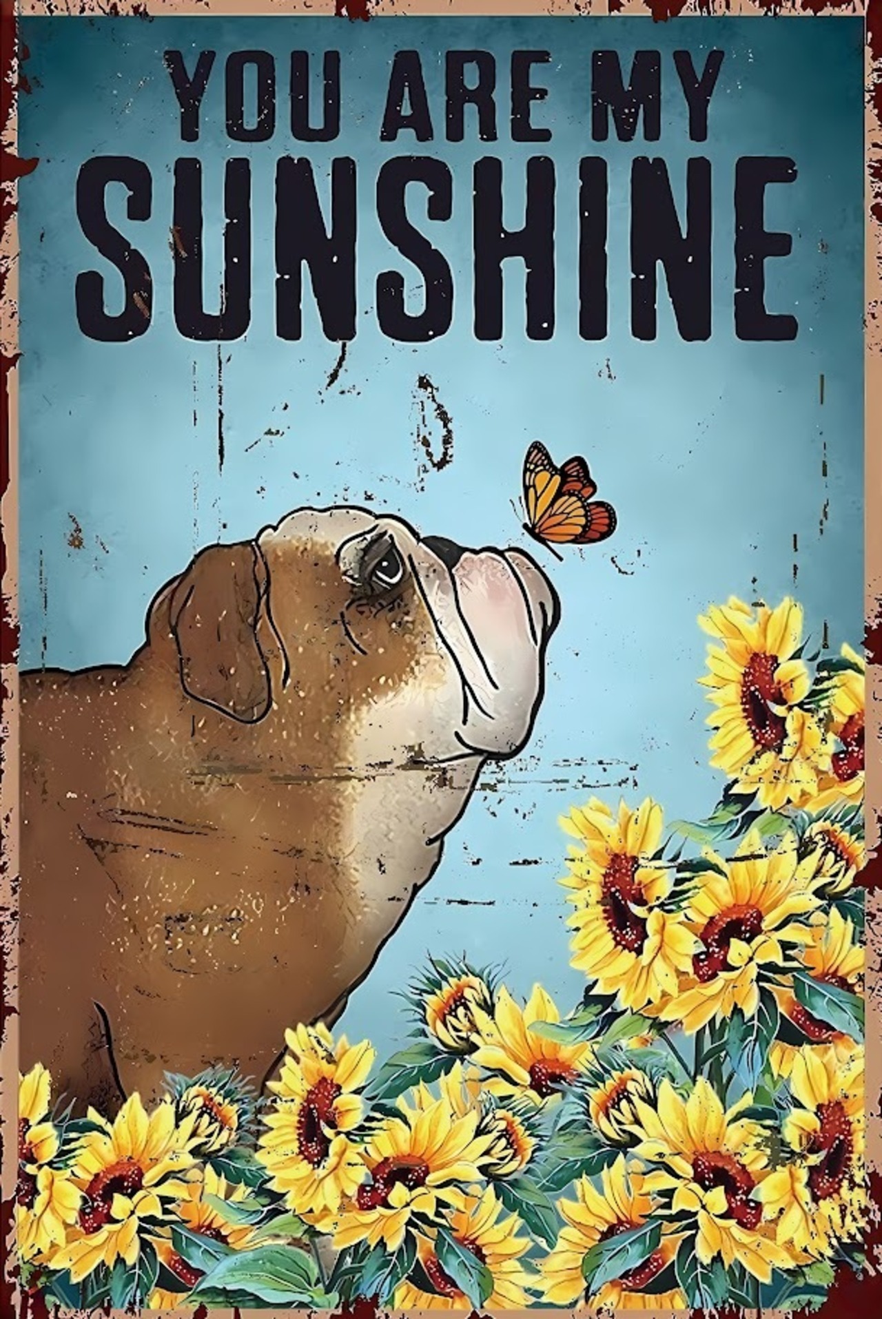 「YOU ARE MY SUNSHINE」の優しい言葉とともに、犬とひまわり、蝶のイラストが心温まるブリキ看板です。