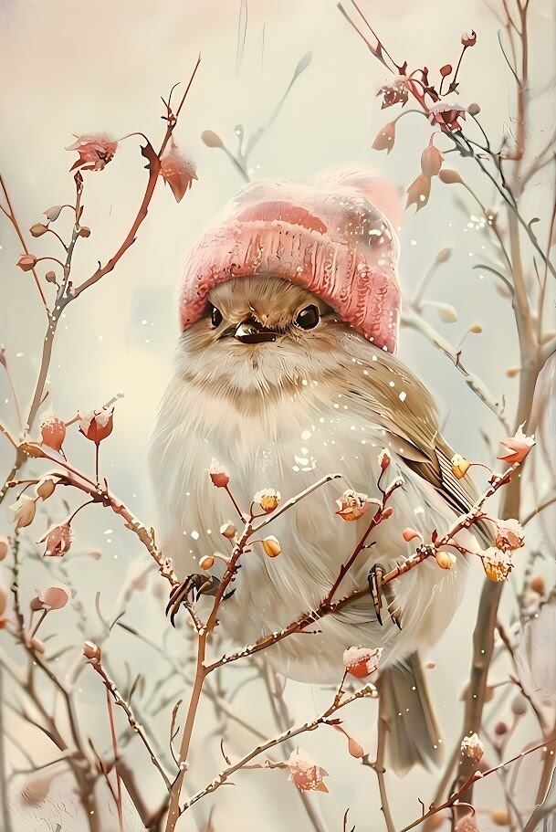 ふんわり丸い小鳥がピンクのニット帽をかぶった、愛らしい冬のブリキ看板です。