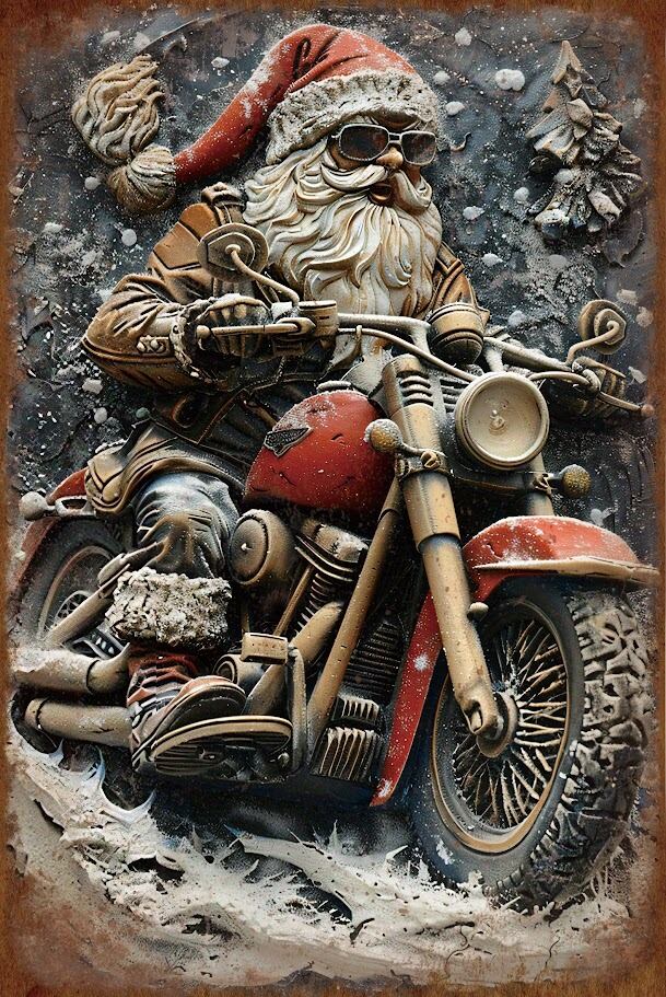 ヘルメット代わりにサンタ帽、サングラスに本革ジャケットと本気装備のサンタクロースが、雪道を走る迫力満点のブリキ看板です。