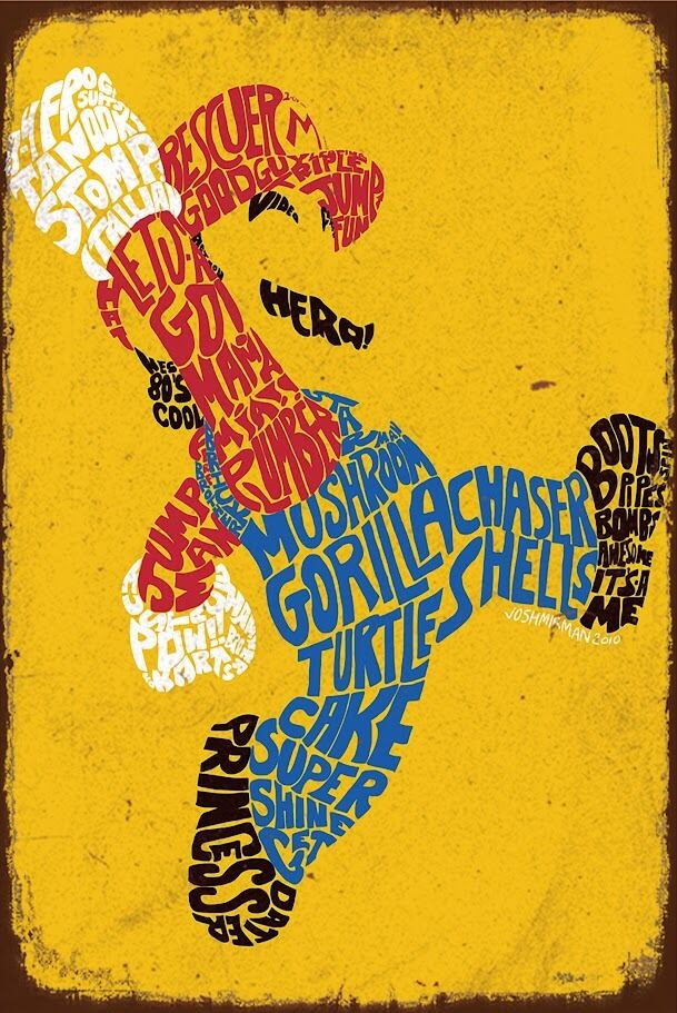 鮮やかなイエローバックに、赤・青・白・黒の文字でマリオを描いたおしゃれなデザイン。