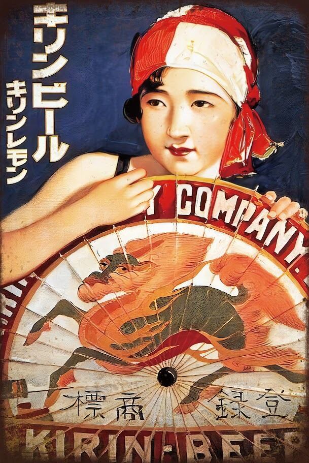 和傘を手にした美しい女性と、伝統的な麒麟マークが印象的なデザイン。