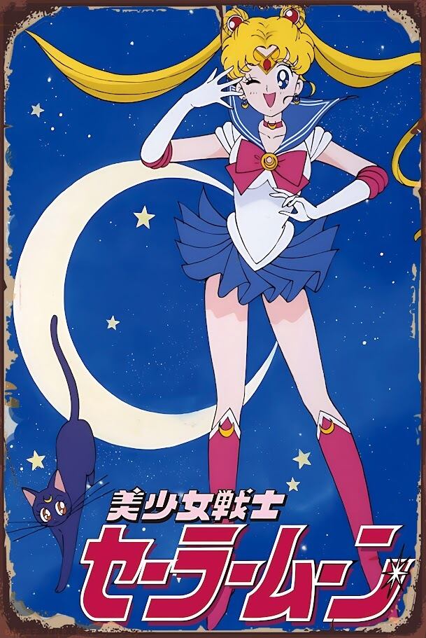 美少女戦士セーラームーンの月野うさぎと黒猫ルナが描かれた、可愛らしいデザインのブリキ看板です。