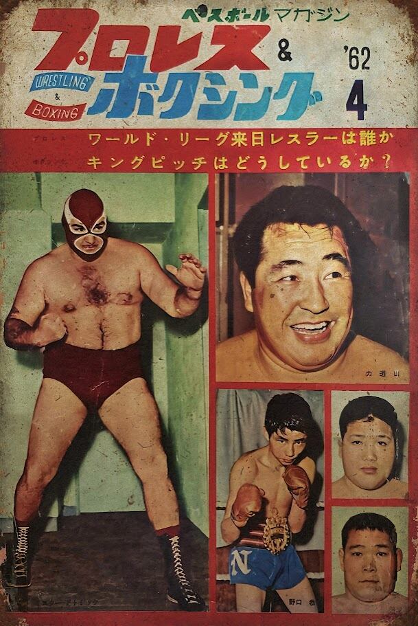 1960年代の熱気あふれる格闘技界を感じさせる、プロレス&ボクシング雑誌表紙デザインのブリキ看板です。