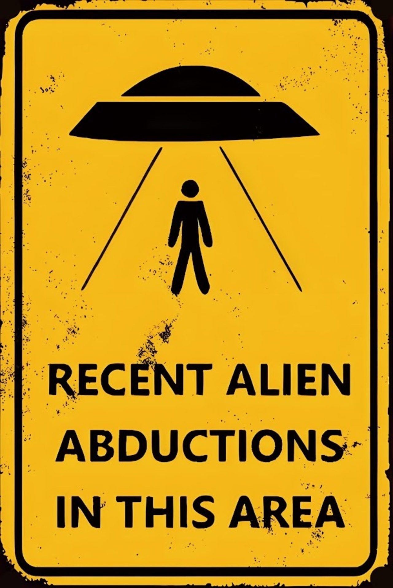 「RECENT ALIEN ABDUCTIONS IN THIS AREA(このエリアで最近エイリアンによる誘拐が発生)」という英語表記がユニークさを引き立てます。