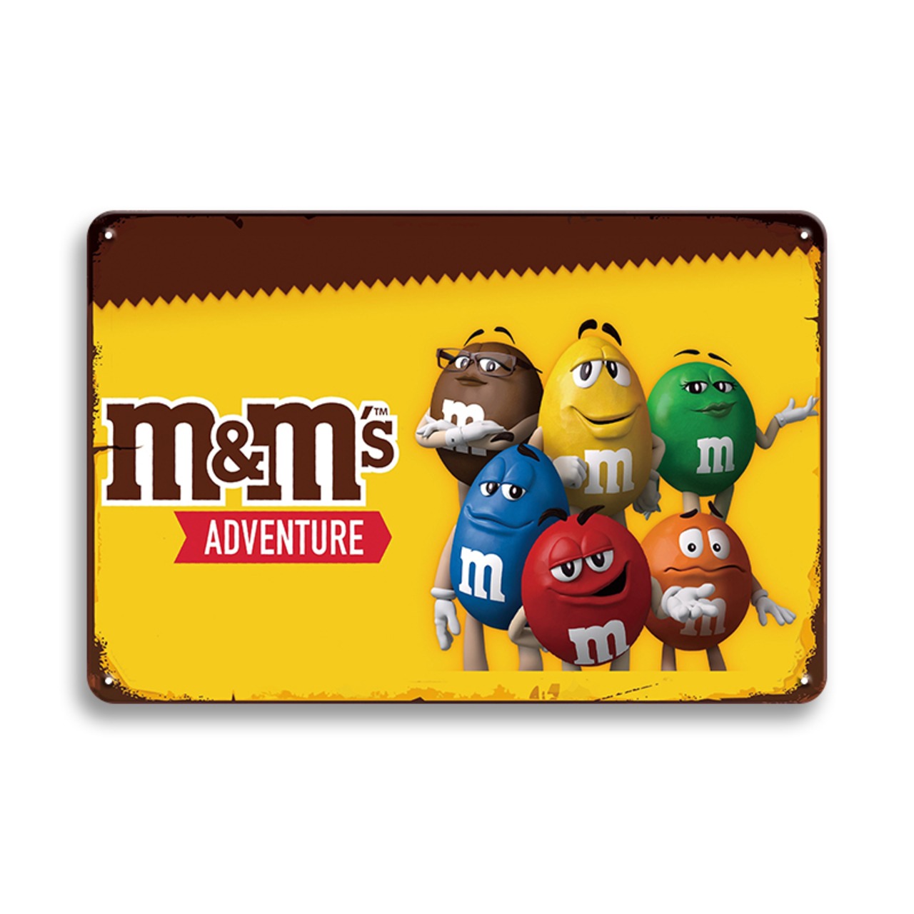 ポップでカラフルなM&M’sキャラクターたちが集合した楽しいデザインのブリキ看板。