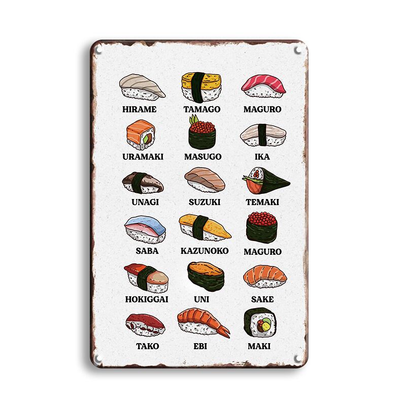 英語で寿司の名前が描かれたおしゃれなブリキ看板です。