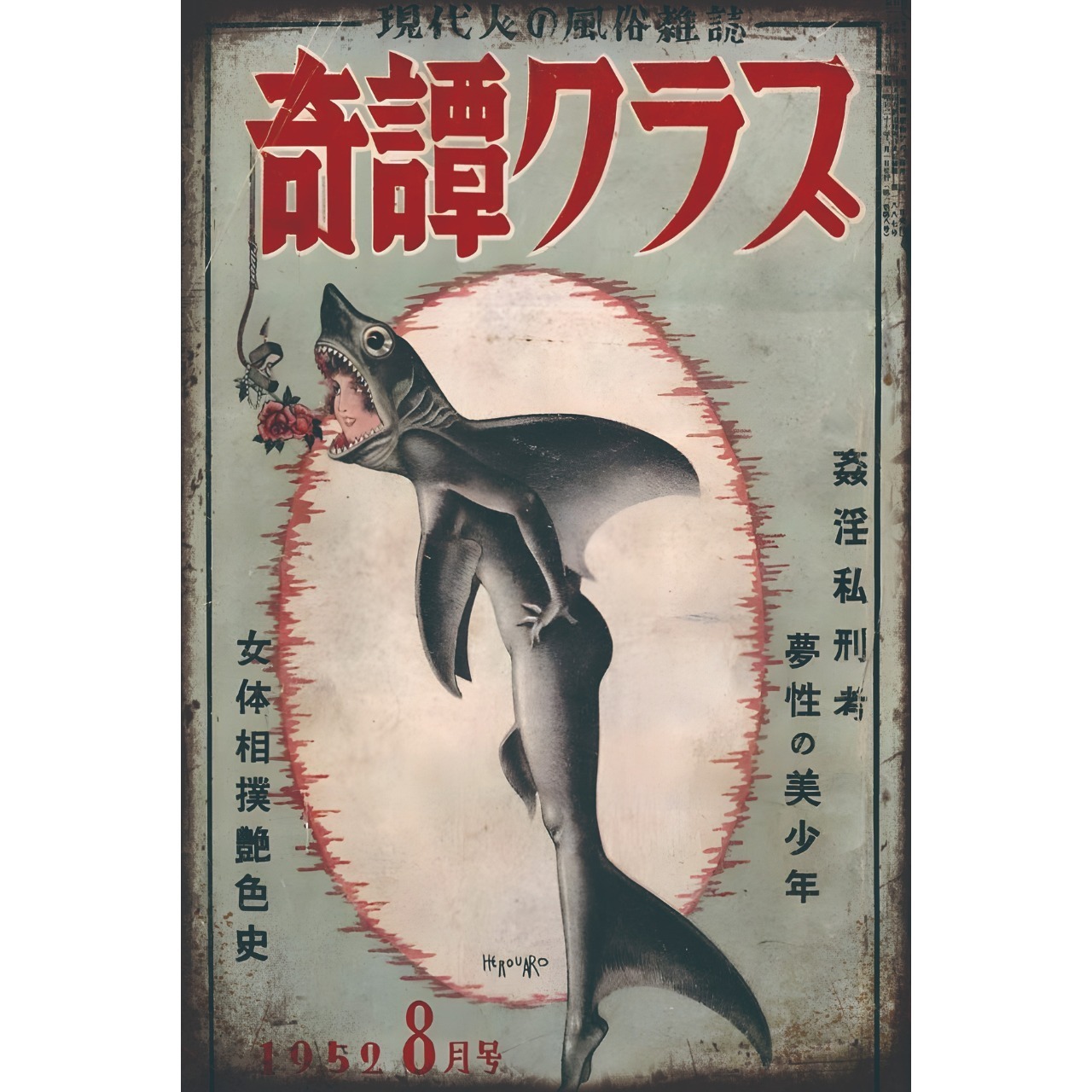 サメの着ぐるみを纏った人物と大胆なビジュアルが印象的で、昭和レトロ独特の雰囲気を演出しています。