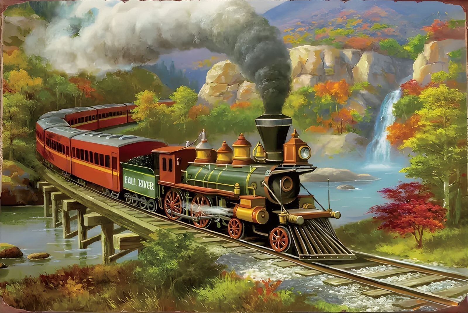 美しい渓谷を走る「FALL RIVER」号の蒸気機関車が描かれた、迫力あるブリキ看板です。