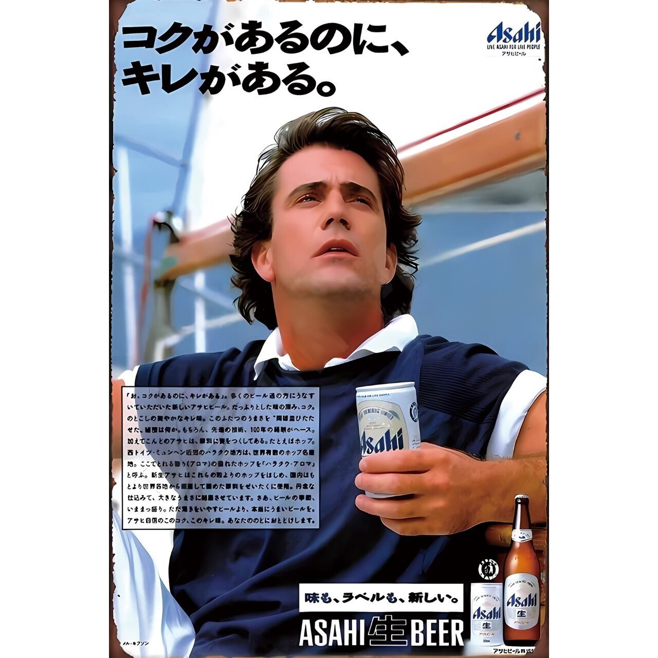 昭和レトロなアサヒビールの広告デザインを再現したブリキ看板です。