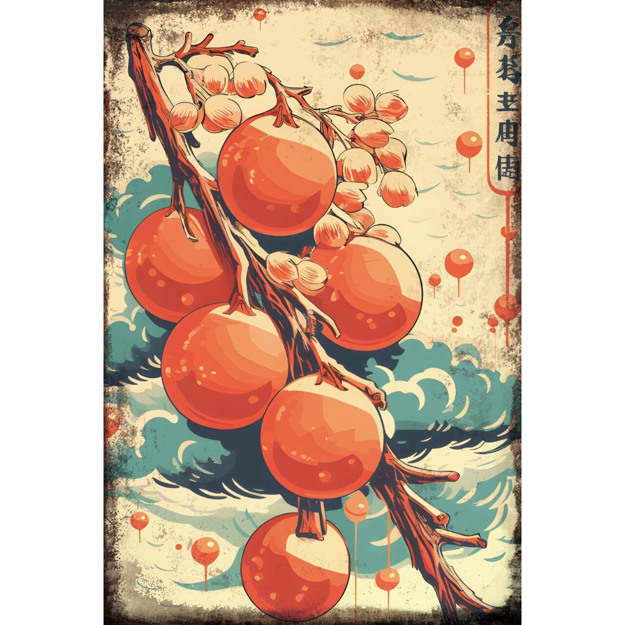 波模様の背景に柿の実が映える、日本の美意識を感じさせるデザインです。