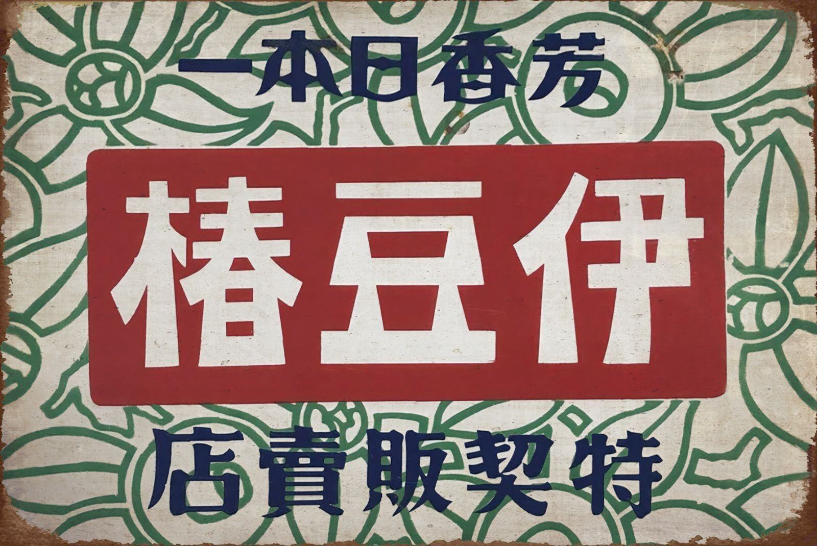 「椿豆伊」の文字が描かれた、レトロな日本の広告デザインを再現したブリキ看板です。