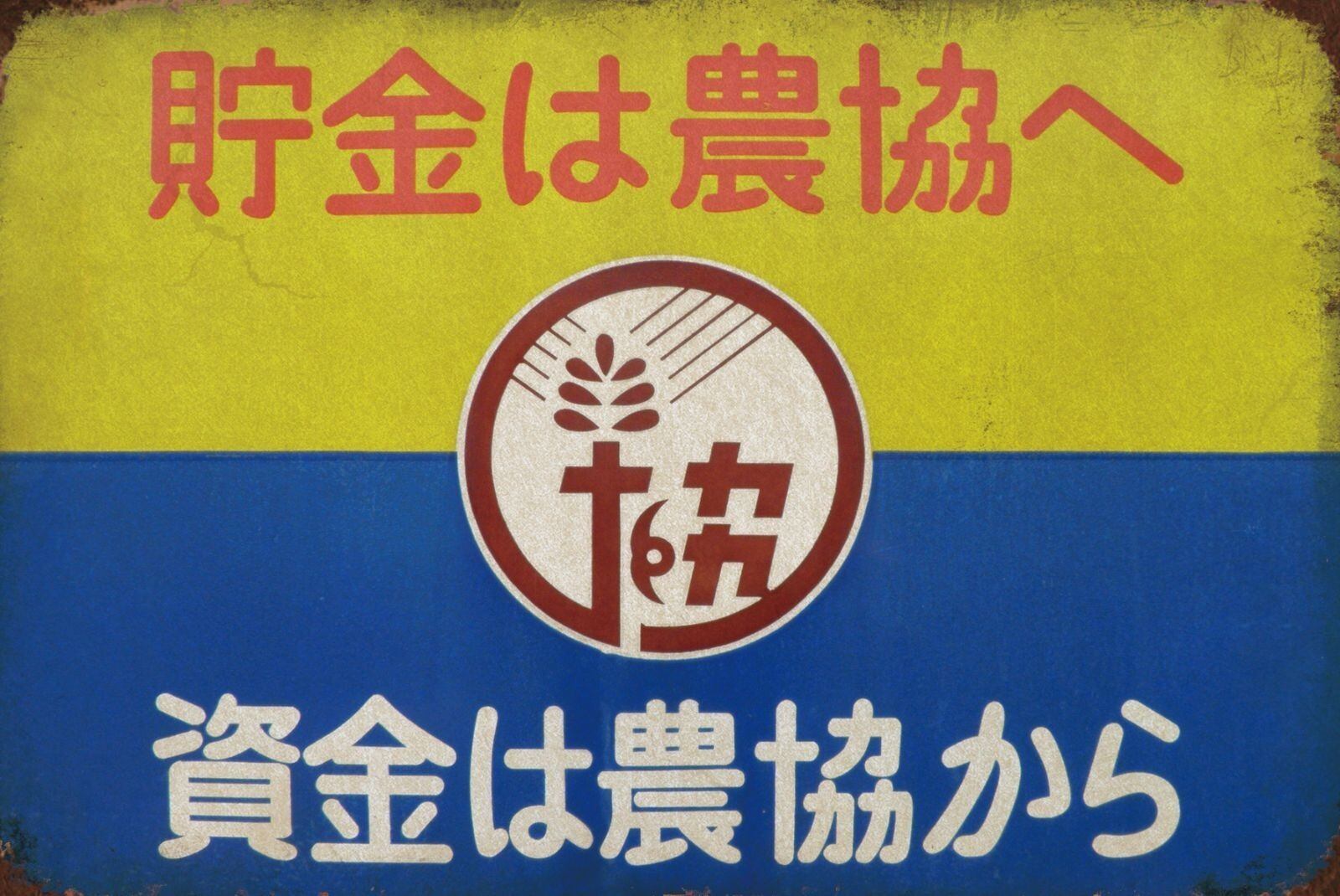 昭和レトロな農協(農業協同組合)の広告デザインを再現したブリキ看板です。