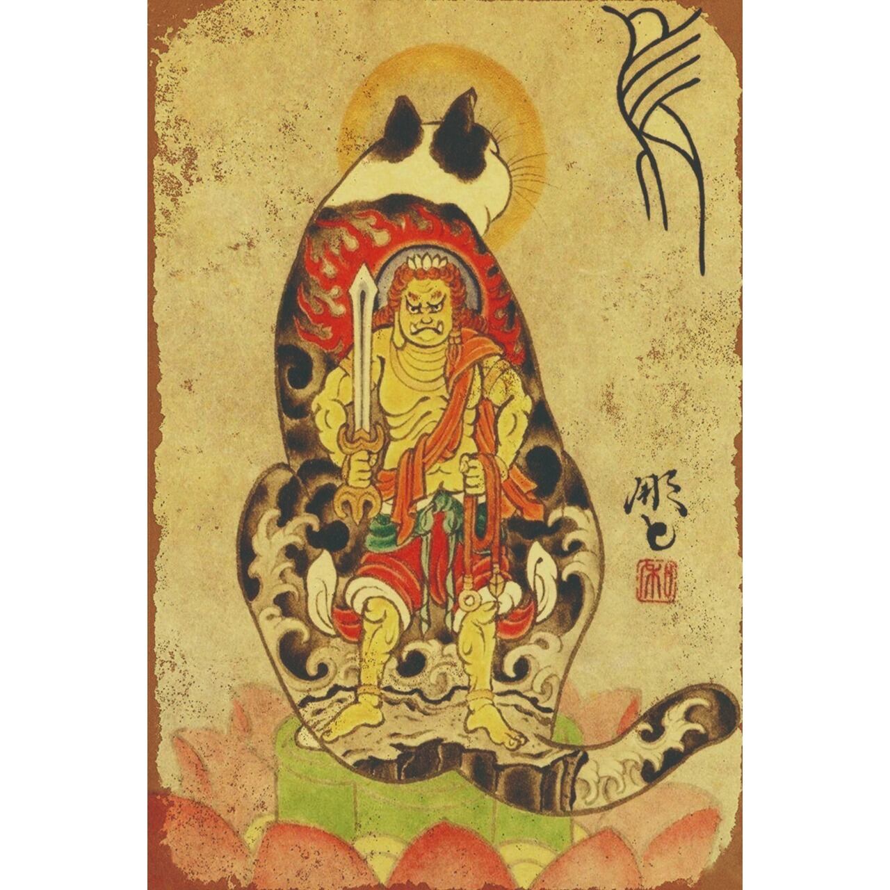 猫の体に不動明王を描いた、迫力と遊び心を兼ね備えた和風ブリキ看板です。