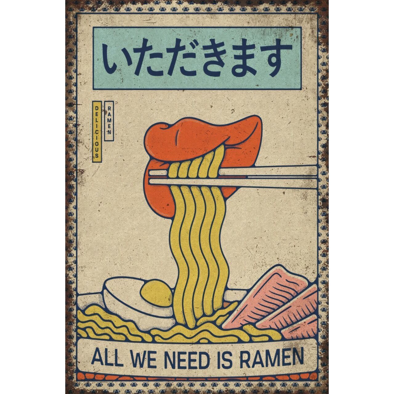 「いただきます」とラーメンをモチーフにした、ユーモアあふれるブリキ看板です。