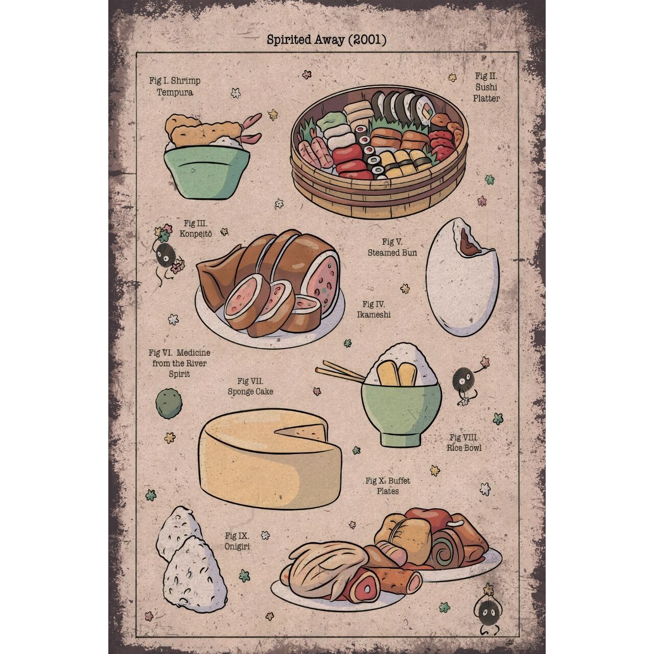 幻想的な世界観と料理モチーフを図鑑風に描いたブリキ看板です。