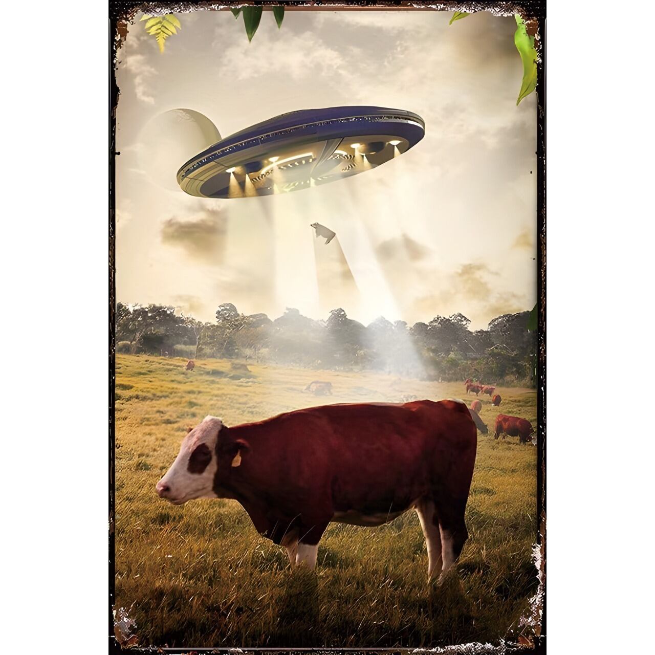 牧草地に現れたUFOと牛を描いた、ミステリアスな雰囲気のブリキ看板です。