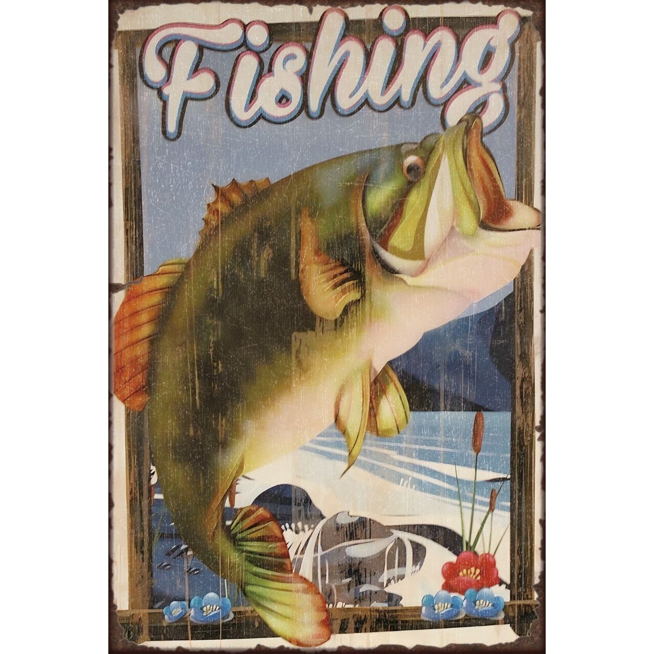 大きな魚を描いた、迫力あるフィッシングデザインのブリキ看板です。