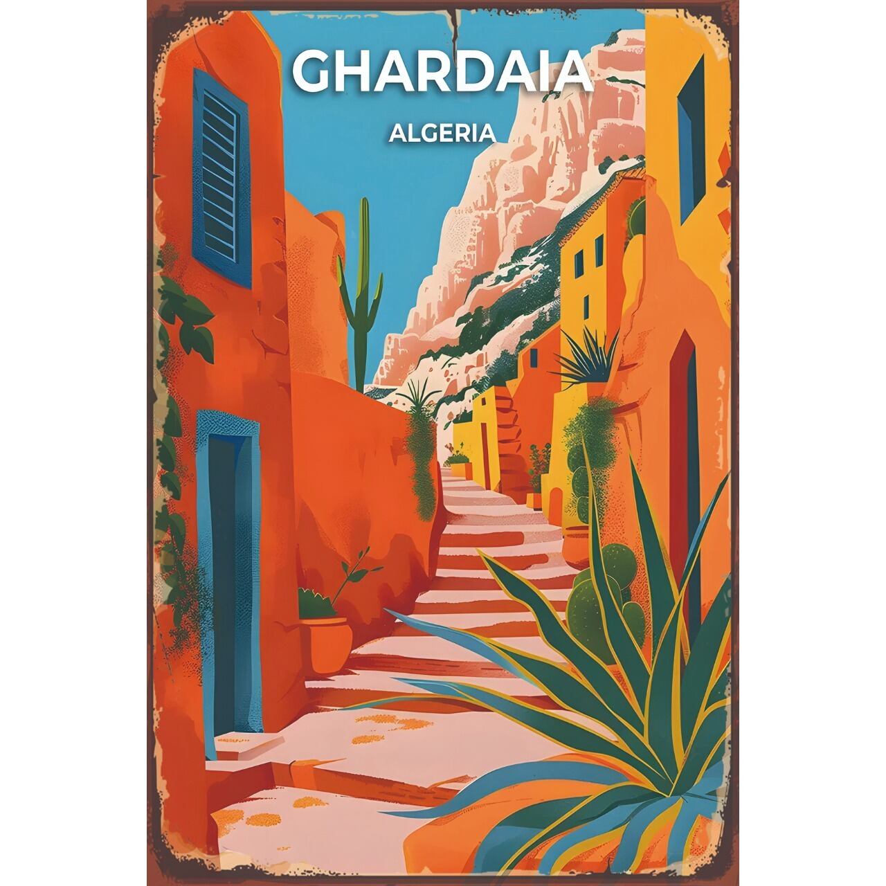 北アフリカの街並みを描いた、旅情あふれるデザインのブリキ看板です。