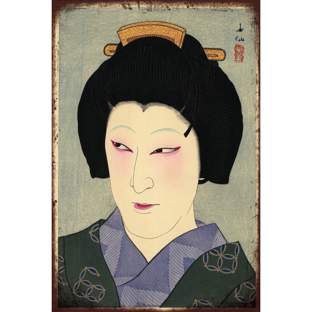 日本の伝統美を感じさせる、浮世絵の美人画をモチーフにしたブリキ看板です。