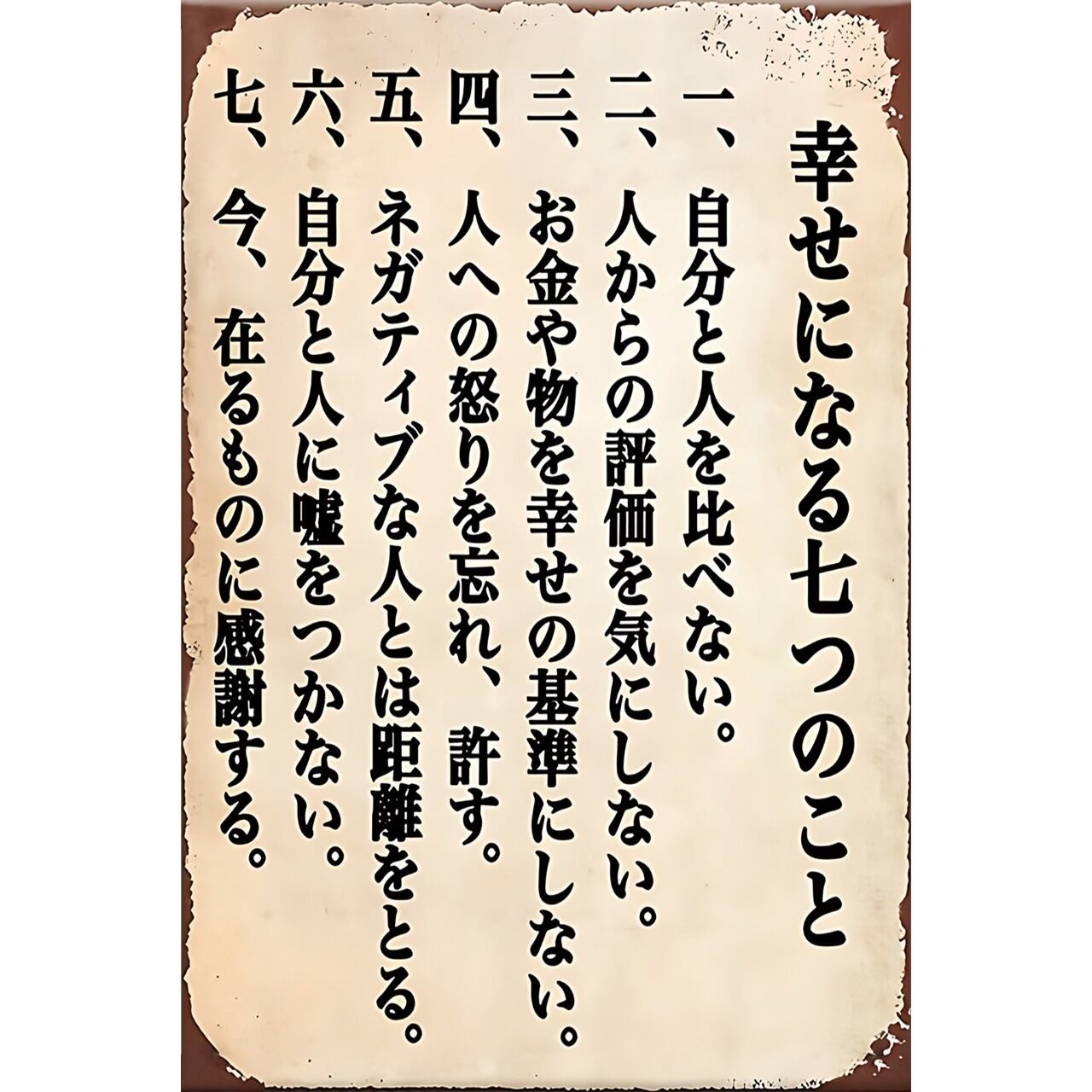 「幸せになる七つのこと」が縦書きで描かれた、心に響く名言デザインのブリキ看板です。
