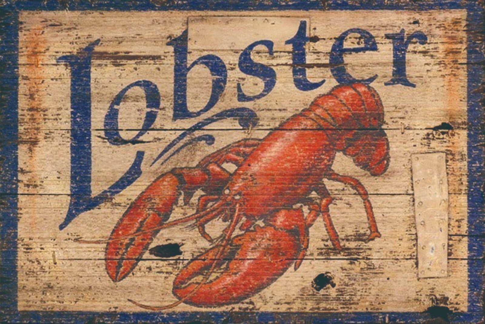 木目調デザインにリアルなロブスターが描かれた、存在感のあるブリキ看板です。