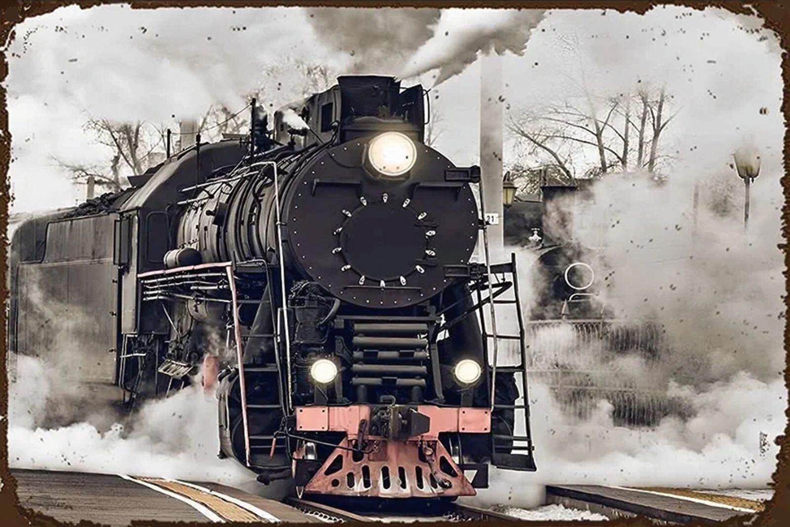 迫力ある蒸気機関車(SL)が正面から力強く迫ってくるデザインのブリキ看板です。