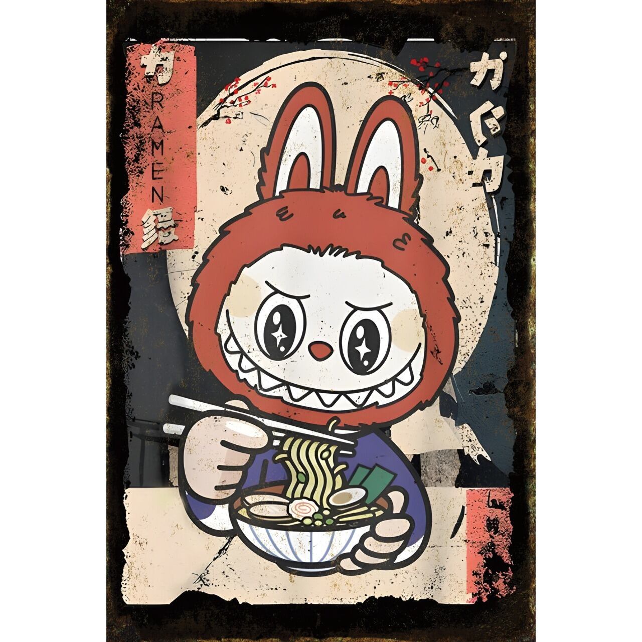 ラーメンを楽しむキャラクターデザインのブリキ看板です。