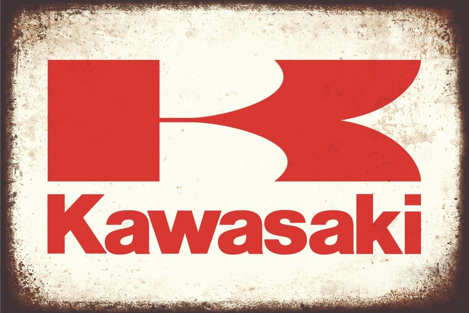 Kawasaki(カワサキ)のロゴデザインを大胆にあしらったブリキ看板です。