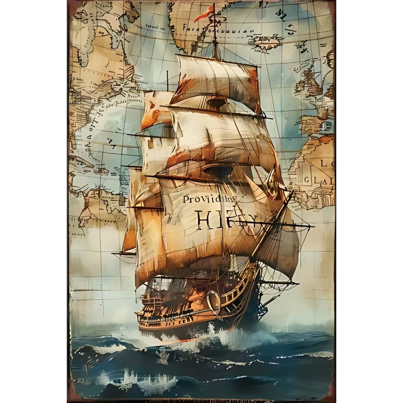 アンティーク調の航海船と世界地図をモチーフにしたブリキ看板です。