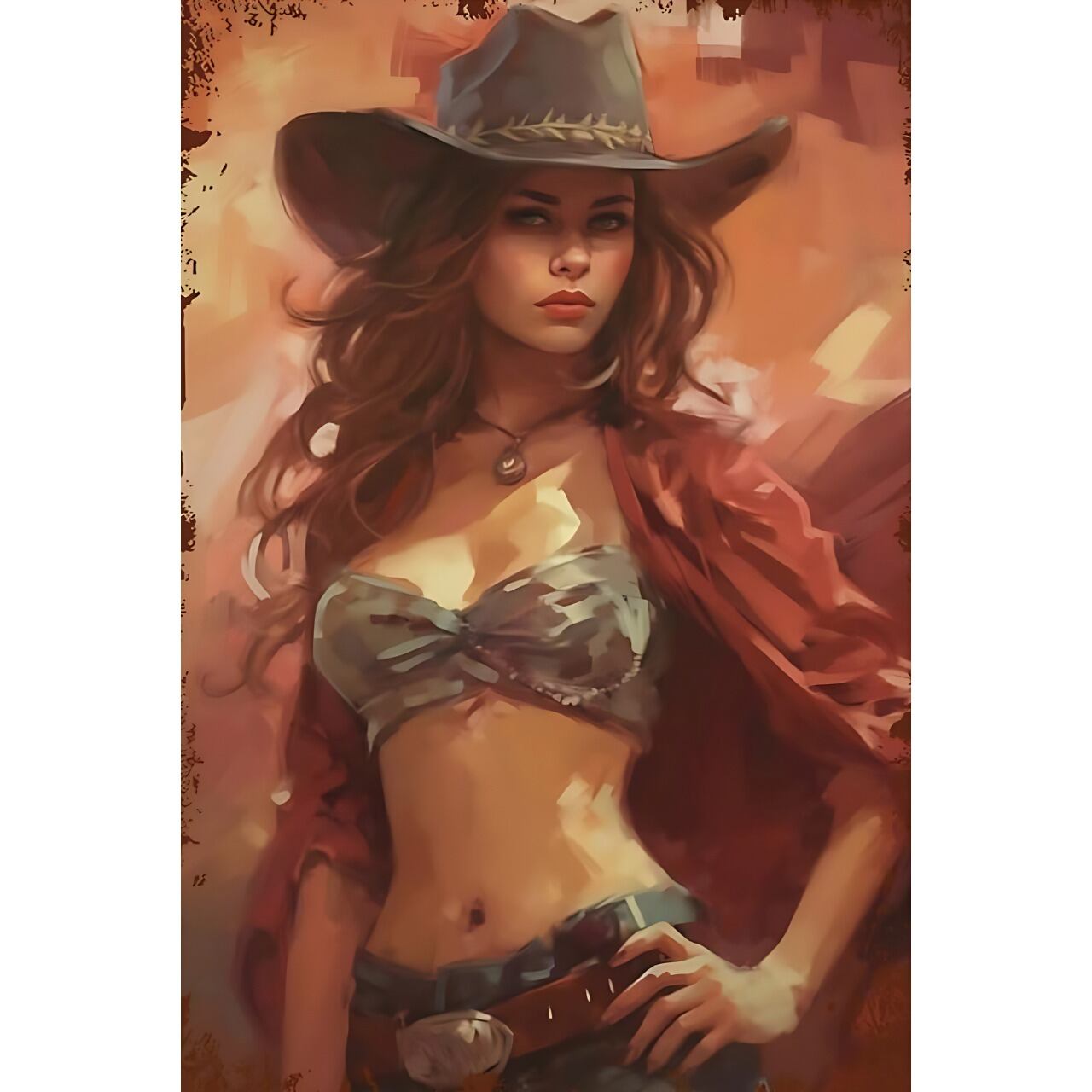 レトロな雰囲気漂うウエスタンカウガールを描いたブリキ看板です。