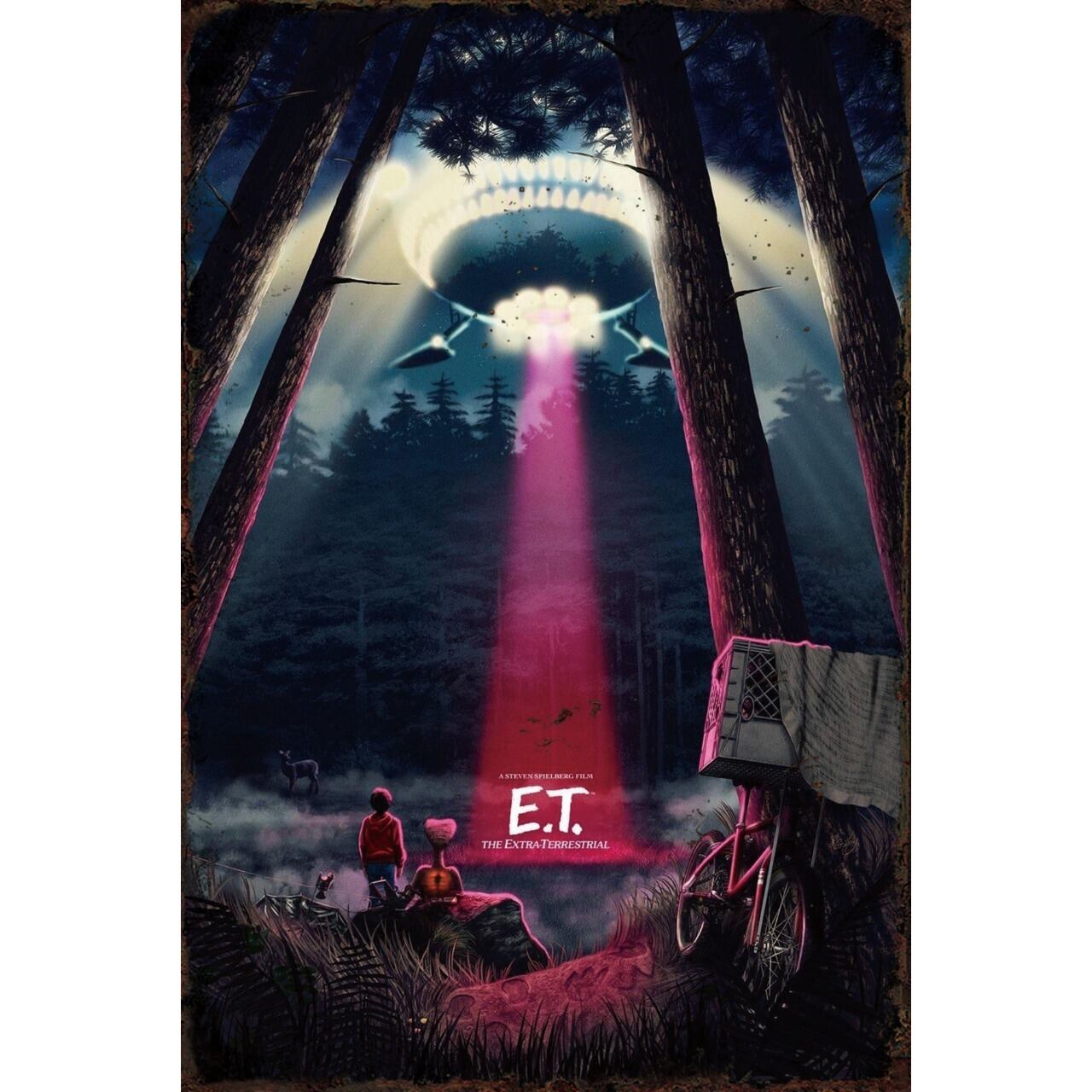 幻想的な夜の森とUFO、そして名作映画を彷彿とさせるデザインが印象的なブリキ看板です。