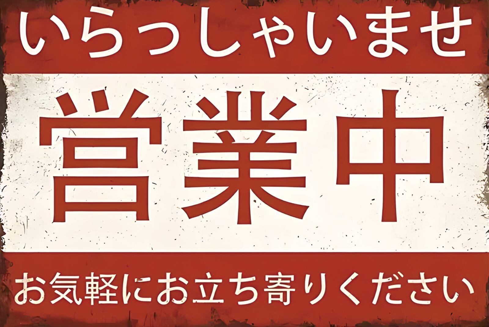 日本語デザインが印象的な「営業中」「いらっしゃいませ」のブリキ看板です。