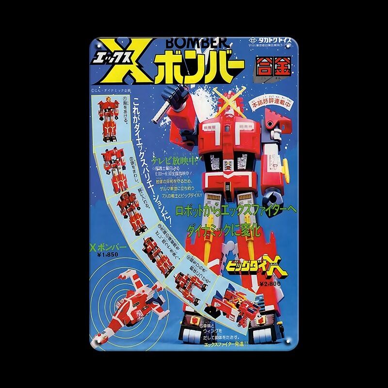昭和ロボット玩具をモチーフにした「ボンバーX」の迫力あるデザインが魅力のブリキ看板です。