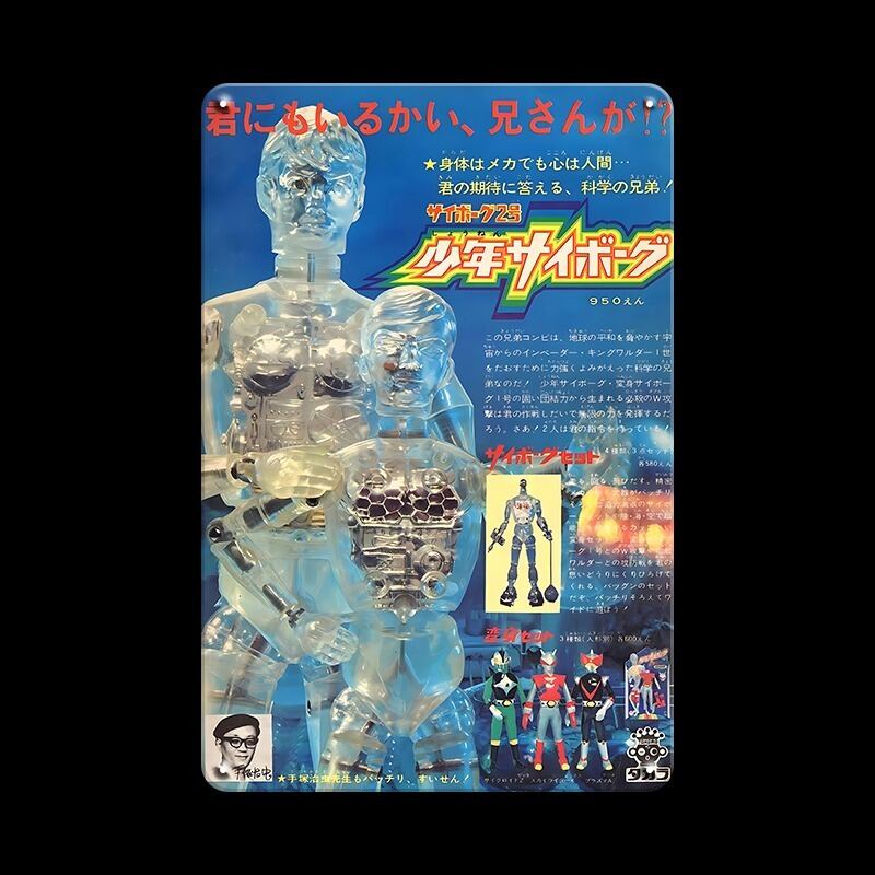 昭和特撮・SFテイストあふれる「少年サイボーグ」をモチーフにした迫力あるデザインのブリキ看板です。