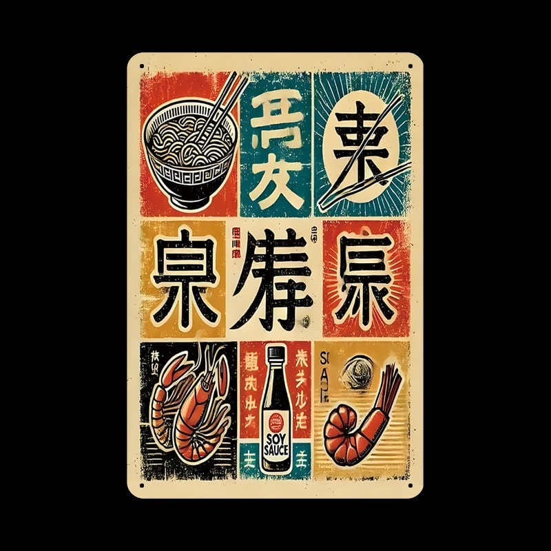 日本食をモチーフにした、アート感あふれる和風デザインのブリキ看板です。