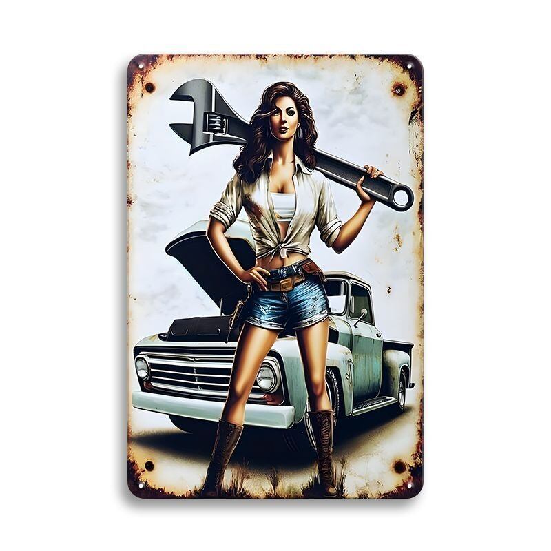 クラシックカーとスパナを持った女性が描かれた、存在感抜群のピンナップデザインのブリキ看板です。