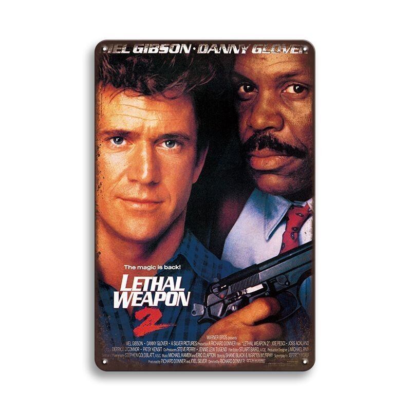映画「リーサル・ウェポン2」の迫力あるビジュアルをデザインした、存在感抜群のブリキ看板です。