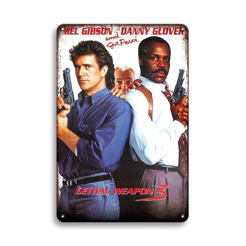 映画「リーサル・ウェポン3」をモチーフにした、迫力あるビジュアルのブリキ看板です。