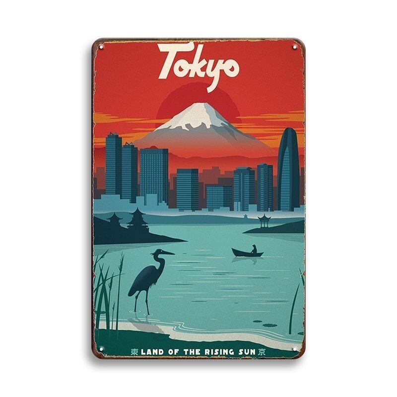 東京の街並みと富士山をモチーフにした、和モダンで美しいデザインのブリキ看板です。