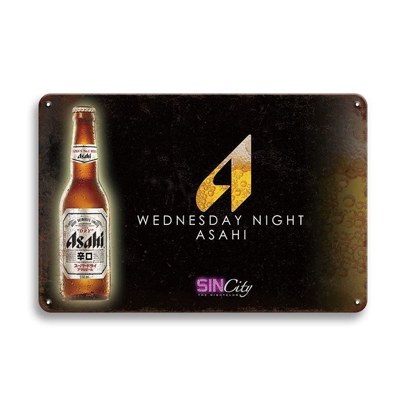 「WEDNESDAY NIGHT ASAHI」の文字が映える、バーやダイニングにぴったりのデザイン。
