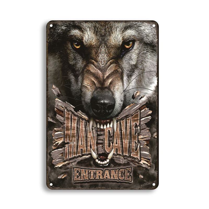 「MAN CAVE ENTRANCE」デザインのブリキ製ブリキ看板です。